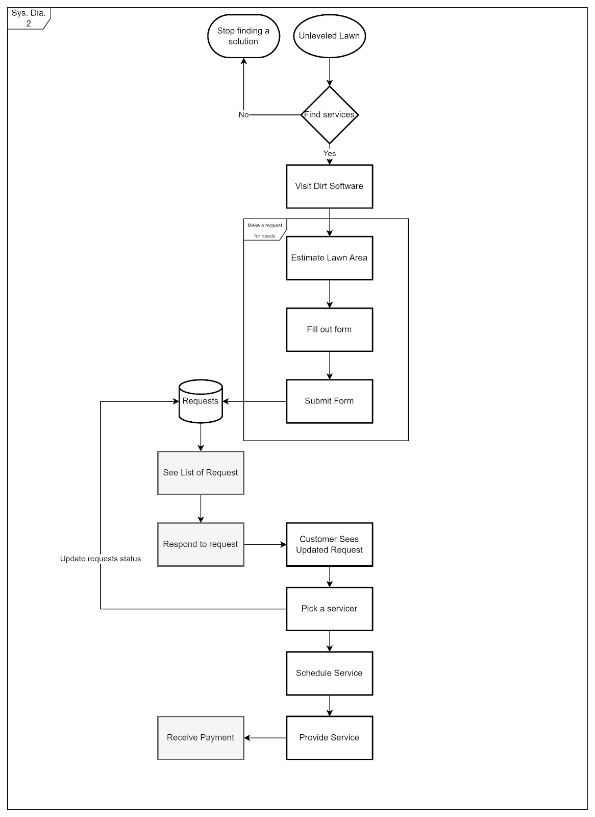 The solution would contain two sides of the application. Side one would allow residences to create a request for yard leveling. Side two would allow contractors to see all the requests for yard leveling in areas they serve to fulfill.